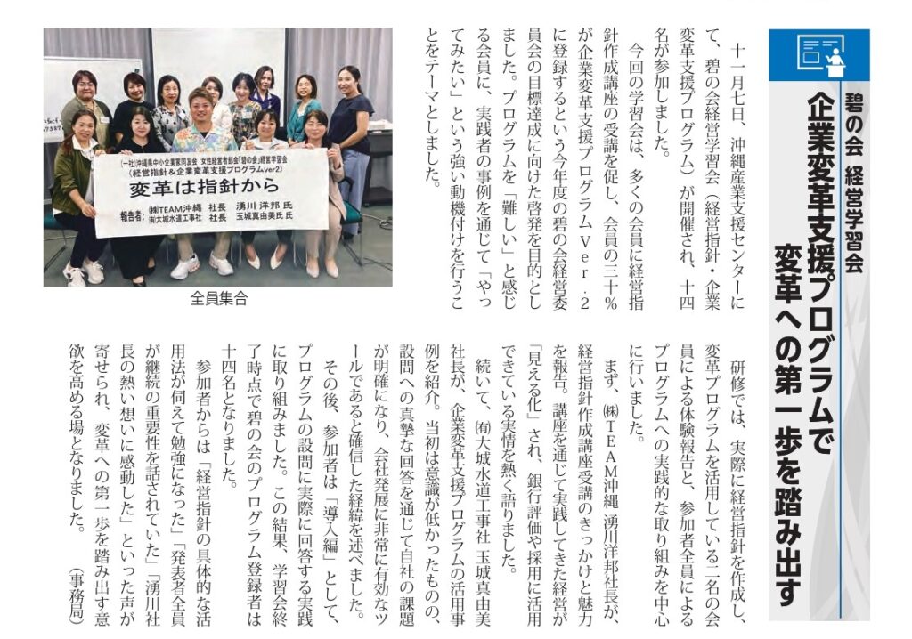 碧の会経営学習会のご報告 報告者:(株)TEAM沖縄 湧川洋邦 氏 (有)大城水道工事社 社長 玉城真由美 氏