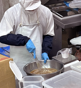冷凍食肉の卸や加工をしていますが、大手食肉会社の委託販売を請け負っており冷凍食品やお惣菜も販売しています。また、祝祭用や慰労会などのヤギ汁やBBQ商品も自社の主力商品です。しかし、以前から冷凍ではなく常温でも販売できる商品の開発を考えていたので、補助金なども活用し自社商品を開発。それが、瓶詰めの『ハンチュミ』(宮廷料理のひとつで沖縄版肉そぼろ)です。ショッピングモールやふるさと納税にも採用され、自社ブランドとして花開いています。