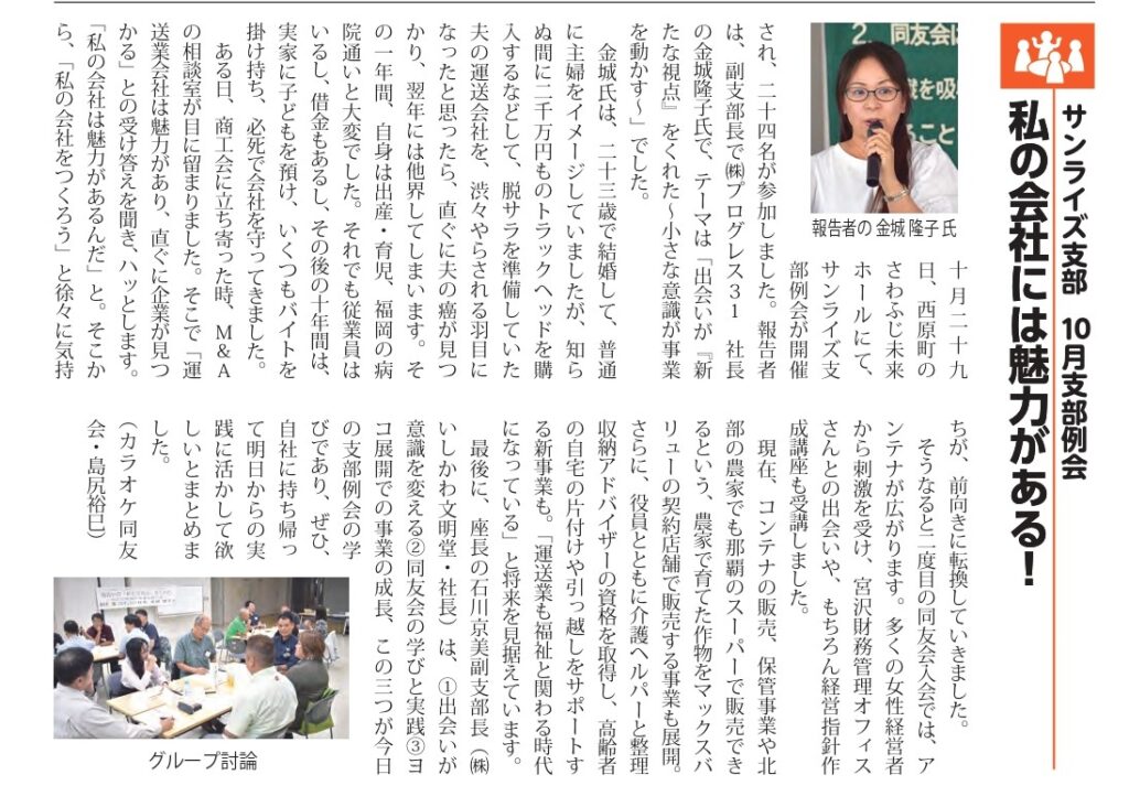 サンライズ支部10月支部例会のご報告 報告者:(株)プログレス31 社長 金城隆子 氏